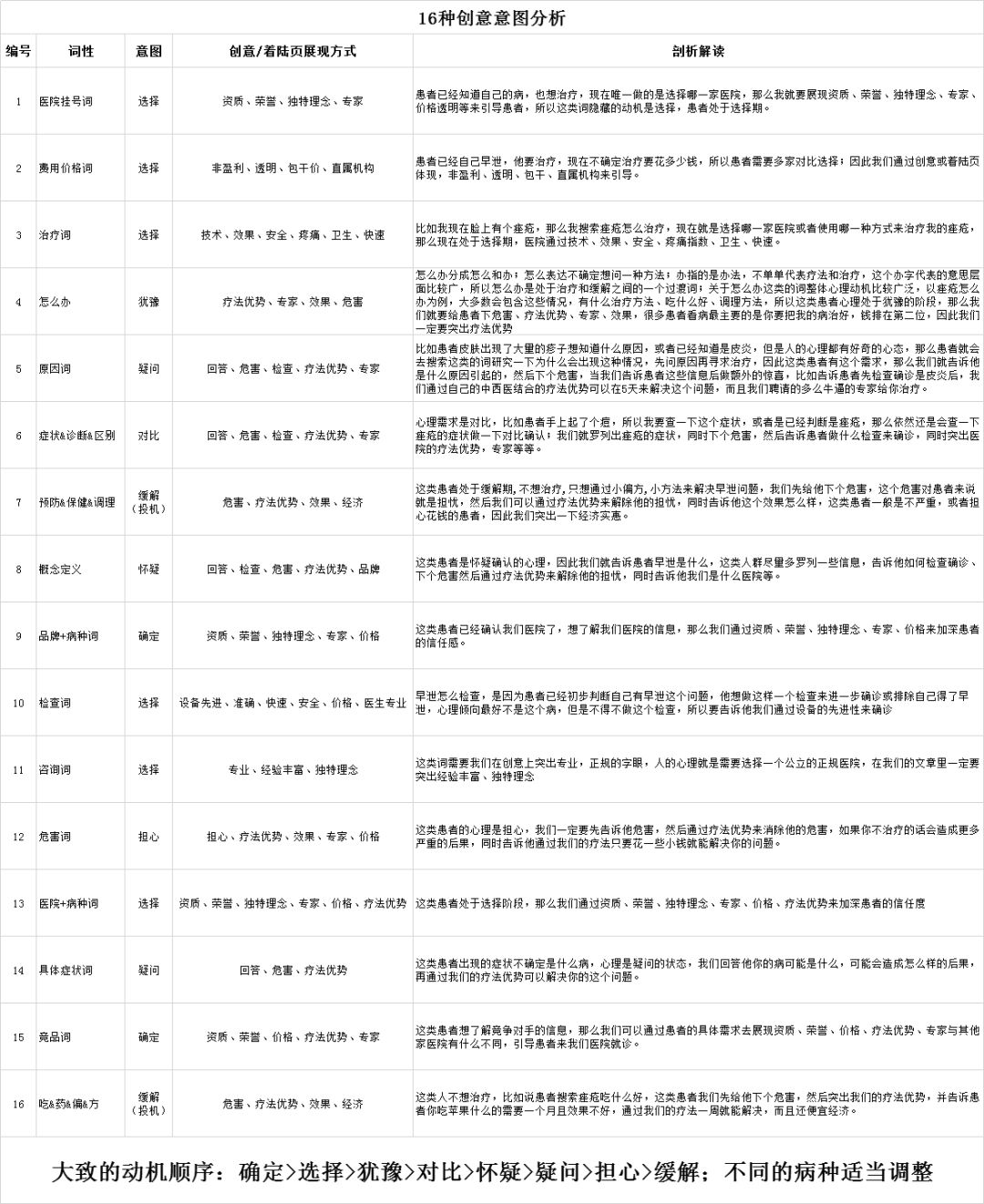 患者的需求無非是治好病,花費少,省事,無痛這些。不同關鍵詞所代表的訪客群體不同,比如費用詞,創意就可以突出價格正規、優惠;比如治療詞,就可以突出醫師專業、設備先進;其它詞性亦然,重點結合患者的心理歷程想清楚患者的真實需求,從而去滿足其需求。
