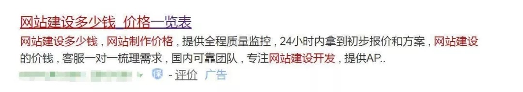 關于創意,很多新手競價員喜歡將創意撰寫得很浮夸,加入了很多免費、1天快速、0元等等夸大的字眼,還有以下這種,我們搜索「網站建設多少錢」,出現了價格一覽表:
