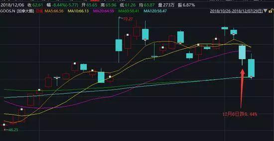 波司登暴漲這個詞條在2018年末登上了熱搜主要原因是加方拘捕華為CFO事件遲遲不能收到回音,環球日報發文稱,中國消費者可能會抵制加拿大羽絨服品牌Canda Goose(加拿大鵝)。的確,自12月4日開始加拿大鵝股價一路暴跌,12月6日當天跌幅就達到8.44%。